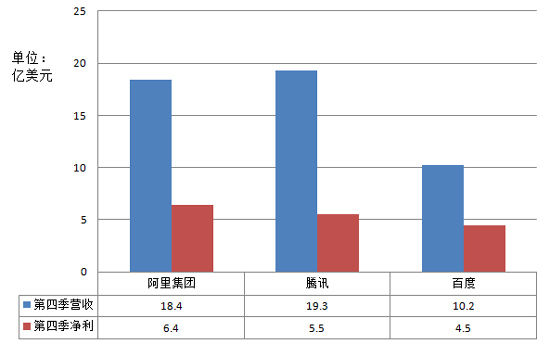 阿里巴巴集团、腾讯和百度去年第四季度业绩