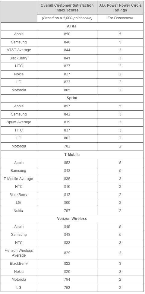 在所有美国运营商智能手机设备整体满意度中,最高的是AT&T用户(844),其次是Sprint(839)、T-Mobile (835)和Verizon无线(829)。整体智能手机用户的满意度为837。