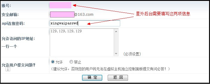 2、点击左侧的“代理商管理”——“API接口配置”,设置好您的接口用户名和密码,允许访问的IP地址填写您的星外系统主控服务器的IP.如图:
