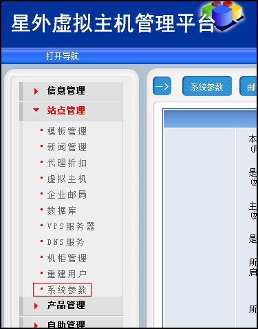 登陆后,点击“站点管理”——“系统参数”,如图: