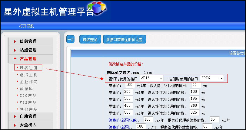 然后点击“产品管理”——“域名注册”,将右侧的所有域名查询接口和注册接口都选择“API6”,如图: