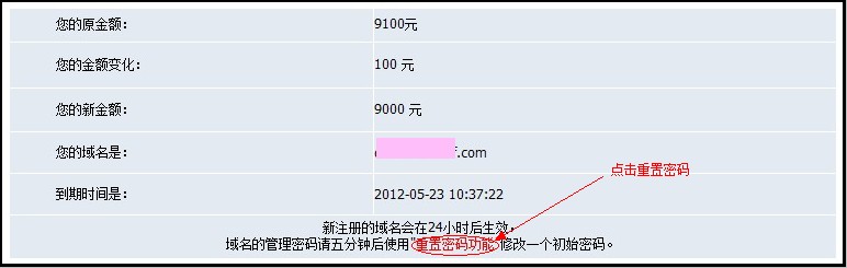 系统会提示您的域名到期时间和重置密码的提示:新注册的域名会在24小时后生效,域名的管理密码请五分钟后使用"重置密码功能"修改一个初始密码。点击“重置密码功能”,如图: